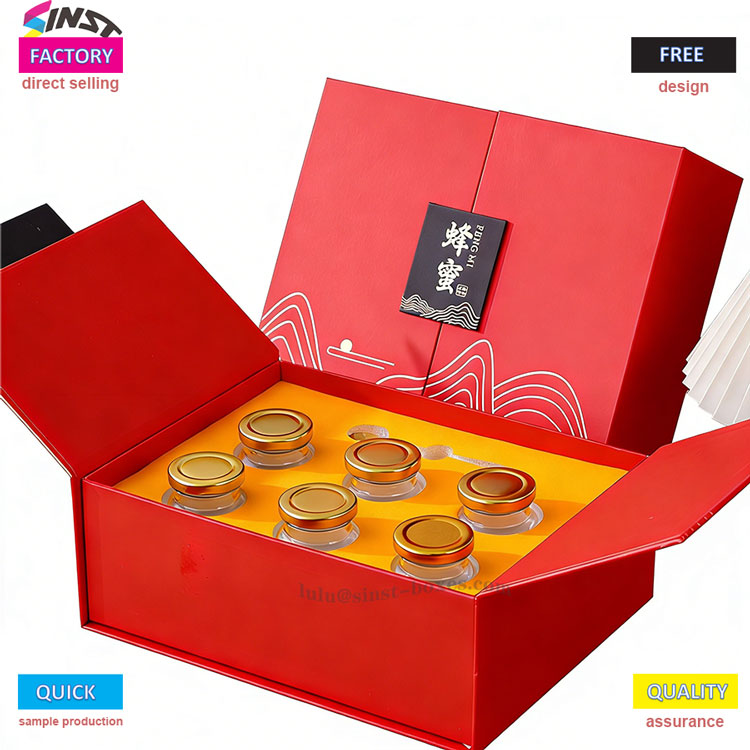 ఈ రెడ్ హనీ గిఫ్ట్ బాక్స్ సొగసైన అలల నమూనాలను అధిక-నాణ్యత హార్డ్ కార్డ్బోర్డ్తో మిళితం చేస్తుంది, సులభంగా నిల్వ చేయడానికి మరియు రవాణా చేయడానికి ఫోల్డబుల్ నిర్మాణాన్ని కలిగి ఉంటుంది. హనీ గిఫ్ట్ బాక్స్ వివిధ రకాల గ్లాస్ జార్ పరిమాణాలకు (తేనె/టానిక్ కోసం) మద్దతు ఇస్తుంది మరియు కంటెంట్లను ఉంచడానికి అనుకూల ఫోమ్ ఇన్సర్ట్తో వస్తుంది. యూరోపియన్, అమెరికన్ మరియు ఆగ్నేయాసియా మార్కెట్లలో బహుమతి ప్రాధాన్యతలకు అనుగుణంగా సెలవు బహుమతులు, వ్యాపార బహుమతులు మరియు ఆరోగ్య ఉత్పత్తుల ప్యాకేజింగ్ కోసం చాలా అనుకూలంగా ఉంటుంది. ఉత్పత్తి విలువను పెంచేటప్పుడు ఈ పెట్టె తేలికైనది, స్టైలిష్గా మరియు ఖర్చుతో కూడుకున్నది.