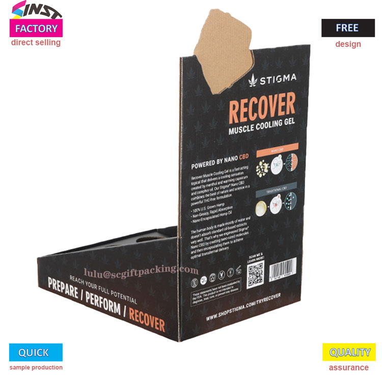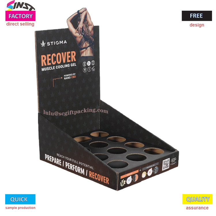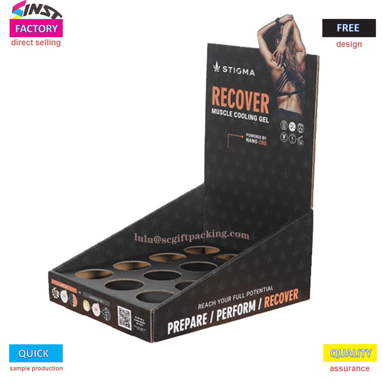 ఖాళీ స్పేస్ పేపర్తో ఉన్న ఈ ఆరోగ్య ఉత్పత్తి ప్రదర్శన పెట్టెలో బ్లాక్ బ్యాక్గ్రౌండ్ హాట్ స్టాంపింగ్ మరియు శక్తివంతమైన దృశ్య ప్రభావంతో మినిమలిస్ట్ సౌందర్యం ఉంది, ఇది వ్యాయామం తర్వాత కండరాల సడలింపు యొక్క ప్రధాన అమ్మకపు బిందువును హైలైట్ చేస్తుంది. డిస్ప్లే ర్యాక్ మల్టీ గ్రిడ్ వృత్తాకార రంధ్రం నిల్వ రూపకల్పనను అవలంబిస్తుంది, ఇది ప్రదర్శనను స్థిరీకరించడమే కాకుండా ఉత్పత్తుల ఆకృతిని విడుదల చేస్తుంది,