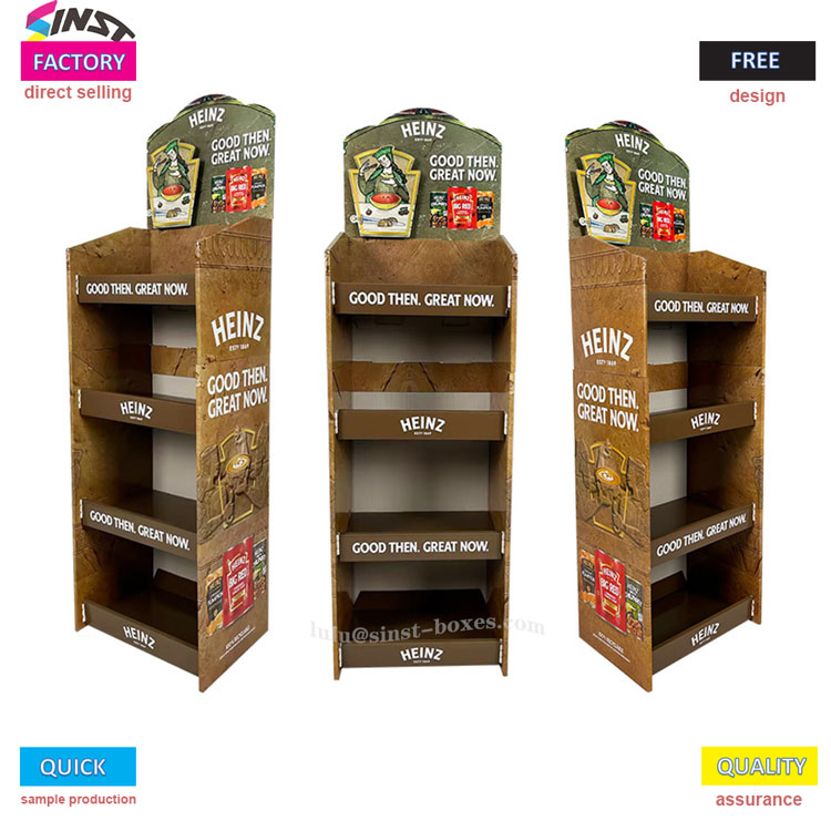 టొమాటో సాస్ కార్డ్బోర్డ్ డిస్ప్లే రాక్ "బలమైన బ్రాండ్ ఎక్స్పోజర్+ప్రాక్టికల్ డిస్ప్లే" చుట్టూ కేంద్రీకృతమై ఉంది, ప్రత్యేకంగా టొమాటో సాస్ కోసం రూపొందించబడింది మరియు సూపర్ మార్కెట్లు మరియు కన్వీనియన్స్ స్టోర్ల వంటి రిటైల్ దృశ్యాలకు అనుకూలంగా ఉంటుంది. టొమాటో సాస్ డిస్ప్లే స్టాండ్ టొమాటో సాస్ యొక్క వివిధ స్పెసిఫికేషన్ల యొక్క లేయర్డ్ ప్లేస్మెంట్ కోసం నాలుగు లేయర్ల నిల్వ స్థలాన్ని అందిస్తుంది. ప్రామాణిక సీసాల నుండి చిన్న ప్యాకేజింగ్ ట్రయల్ ఉత్పత్తుల వరకు, వాటిని సజావుగా మరియు జామింగ్ లేకుండా "వాటి స్థానాల్లో ఉంచవచ్చు".