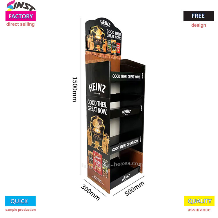 ఈ టొమాటో సాస్ డిస్ప్లే రాక్ సూపర్ మార్కెట్లు మరియు సాస్ను ప్రదర్శించడానికి సౌకర్యవంతమైన దుకాణాలకు "చిన్న సహాయకుడు". ఇది ఒక రకమైన సాస్ డిస్ప్లే రాక్కి చెందినది, కార్డ్బోర్డ్ పేపర్ డిస్ప్లే రాక్తో తయారు చేయబడింది, ఇది తేలికైనది మరియు తీసుకువెళ్లడం సులభం. దాన్ని విప్పి కౌంటర్లో ఉంచిన వెంటనే ఉపయోగించవచ్చు. షెల్ఫ్ నాలుగు పొరలుగా విభజించబడింది, ప్రతి పొరలో రెండు వరుసల టొమాటో సాస్ సీసాలు ఉంటాయి మరియు దాని పక్కన కొన్ని సలాడ్ డ్రెస్సింగ్ మరియు తీపి మరియు కారంగా ఉండే సాస్ కూడా ఉండవచ్చు - దీనిని "టమోటా సాస్ డిస్ప్లే షెల్ఫ్" అని పిలుస్తారు, కానీ దీనిని సాస్ షెల్ఫ్గా కూడా ఉపయోగించవచ్చు. ఇది ఒక చిన్న సూపర్ మార్కెట్ యొక్క మసాలా ప్రాంతంలో ఉంచడానికి అనుకూలంగా ఉంటుంది.